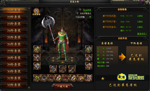 特玩网页游戏烈斩套装衣柜是一个收集系统,玩家通过收集21-40阶的全部武器、衣服、首饰,激活套装收集属性和衣柜升星属性。