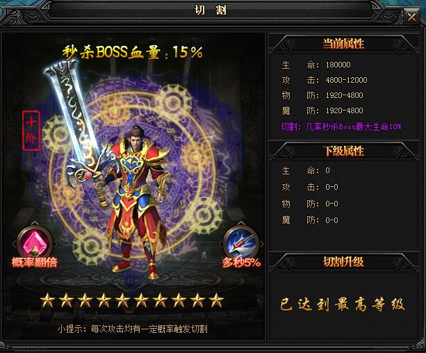 特玩烈斩切割等级一共10阶10星,玩家升级切割需要消耗大量的元宝,元宝获得是比较容易的,切割升级也比较简单,玩家一般第一天就可以直接升满级,建议玩家元宝第一时间全部用在切割升级上。