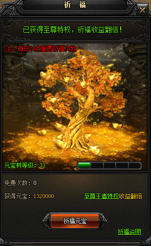 2.每次祈福可增加一格祈福经验,每增加5格祈福经验可提升元宝树1级,元宝树等级越高,每次祈福获得的元宝越多。