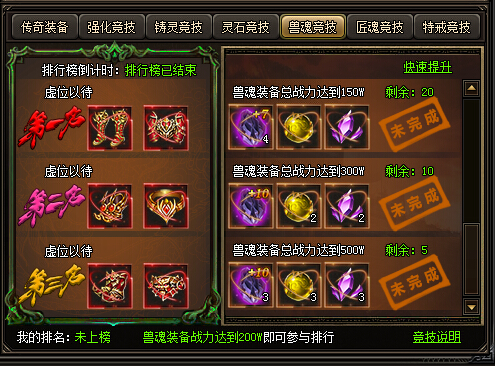 特玩网页游戏烈斩开服第十二天的兽魂竞技,根据任务当前兽魂装备的战力进行排行,战力相同时,先达到的玩家排名靠前。兽魂战力阶段奖励,玩家先到先得。