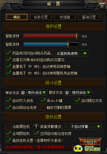 1.玩家勾选血量保护,自动使用药品和自动回城等等。