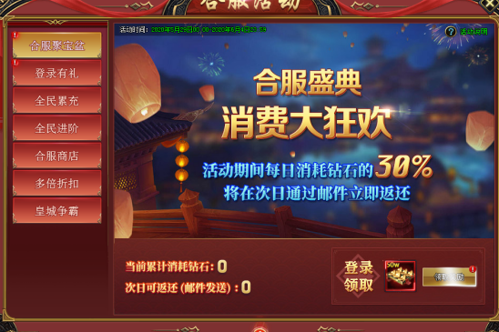 活动期间每日消耗的充值钻石数的30%将在次日通过邮件返还!消费越多返的越多!