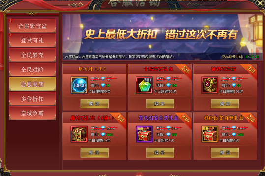 活动期间合服商店每日刷新超低价商品,玩家可以购买限定次数的商品。