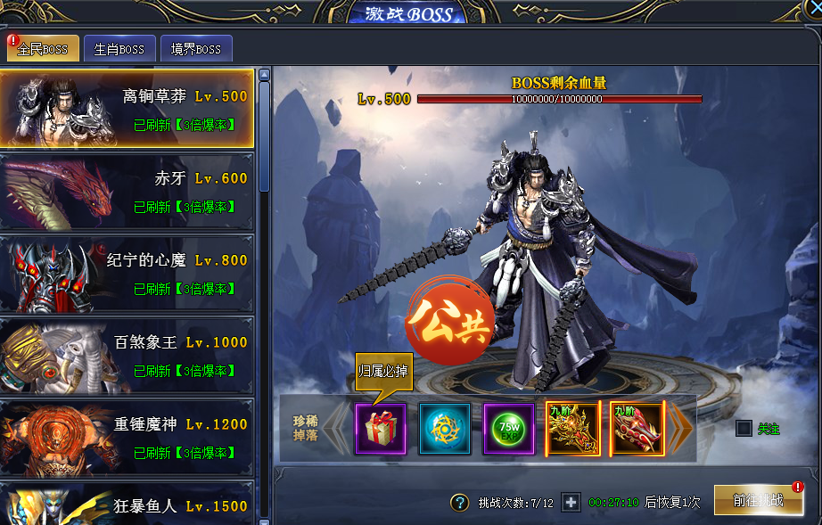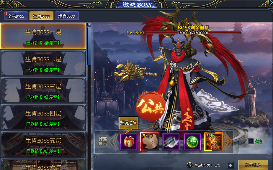 全民BOSS!所有玩家都可以参与!进入全民BOSS副本需要挑战次数,挑战次数两小时恢复一次,当挑战次数为零时,无法进入全民BOSS副本!
