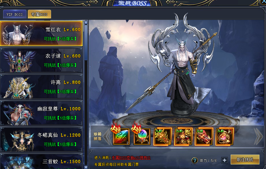专属BOSS! 至尊4以上玩家可以开启专属BOSS挑战,通过专属BOSS卷轴可以进入专属BOSS副本,专属BOSS有几率掉落高级装备合铸魂石等,专属BOSS为个人挑战,每天有体力次数限制!