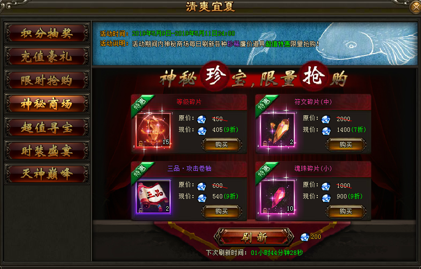 2.活动期间内,神秘商场每日刷新各种珍稀道具,打折出售限量抢购。