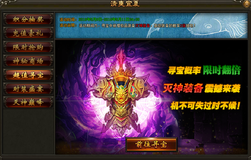 1.活动期间,王之宝藏可抽取灭神装备!高级装备概率翻倍!活动限时3天,机不可失过时不候