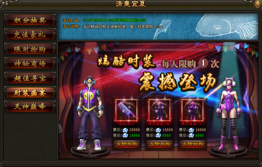 2.活动期间内,玩家可购买绝版活动时装,每个玩家限购一次