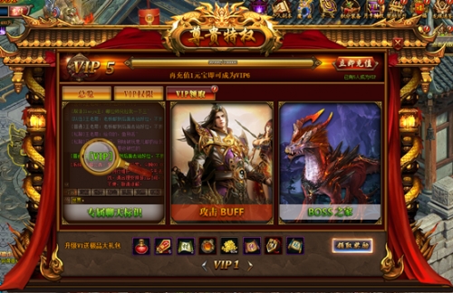 成为VIP用户即可获得海量特权,如相应等级大礼包、专属聊天标识、额外攻击BUFF、更多每日活动次数、一键完成日常任务、专属BOSS地图BOSS之家,升级打宝更容易!而随着玩家的VIP等级不断提升,获得的特权也会越多!