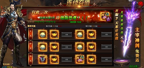 累计充值3天,每天充值1000元宝(高级转生丹*5 1000元宝),每天充值5000元宝(超级转生丹*5 3000元宝)