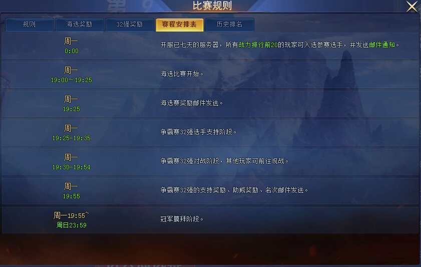 6.在周一海选19:25结束时通过邮件结算奖励,前32名进入争霸赛。