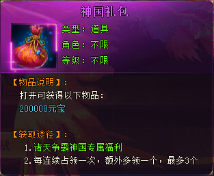 2.帮派奖励:帮派成员每天可以领职一个神国礼包,每连续占领一次,神国领取个数就会+1,最高上限3个