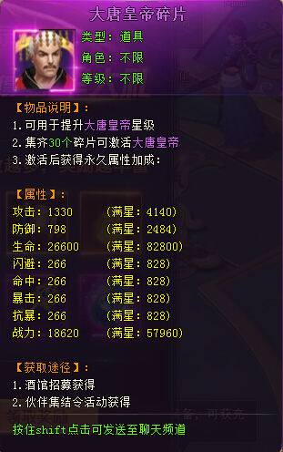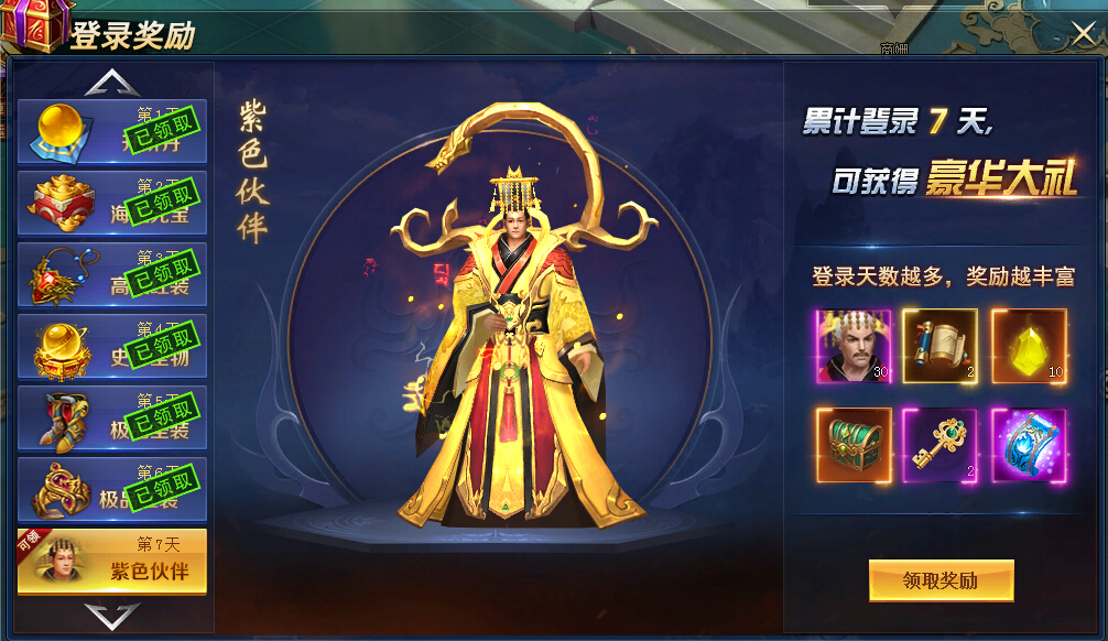 登陆奖励是七战中非常重要的免费福利,开服7天,每天都可以领取大量的道具材料奖励,第七天的紫色伙伴-大唐皇帝还是非常不错的,激活后可以获得大量的属性加成。