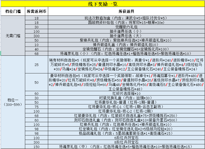 1、每个档位的返利比例不同,该返利并非是给游戏内货币,而是线下礼包的购买货币。(重点!)