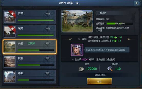 每座城池都有建筑,玩家通过建造进入城池建筑界面,每种建筑都有独特的效果,包括提升城池城防军数量上限,城墙血量上限,临近城行军速度加成,城池上缴国库银两、粮食等效果。建筑等级越高,提升属性越多。