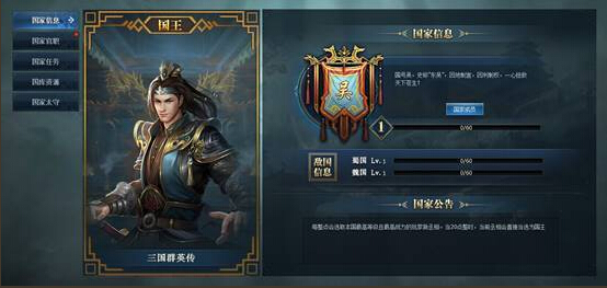国家信息:显示本国的国王形象,本国的国家公告,以及三个国家各自的等级、经验等信息。