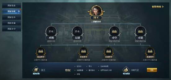 国家官员由一位国王、四位一品官员、四位将军所组成。国王、官员、将军每天能获得俸禄,每个官职负责相应的国家事务权限。如使用军令之权,分配太守之权,禁止本国成员禁言之权等。在国战期间,国家的官员起着至关重要的作用。军令的使用,以及战术的安排,都是国战胜负的成败关键。