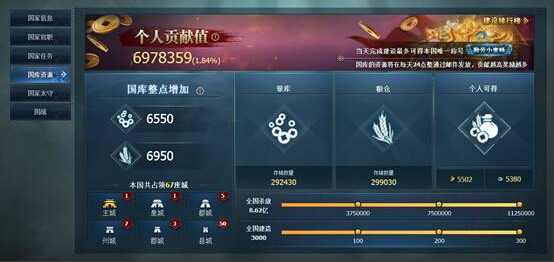 国库资源:国库资源来源于占领城市建筑每个整点上缴的资源以及国家任务奖励。