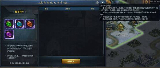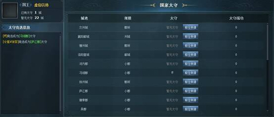 本国玩家完成城池民情任务后可申请相应的城池太守。无太守的城池,将在21:00结算,太守申请榜第1名玩家成为该城太守。太守每个季度可收到城池特产作为奖励。