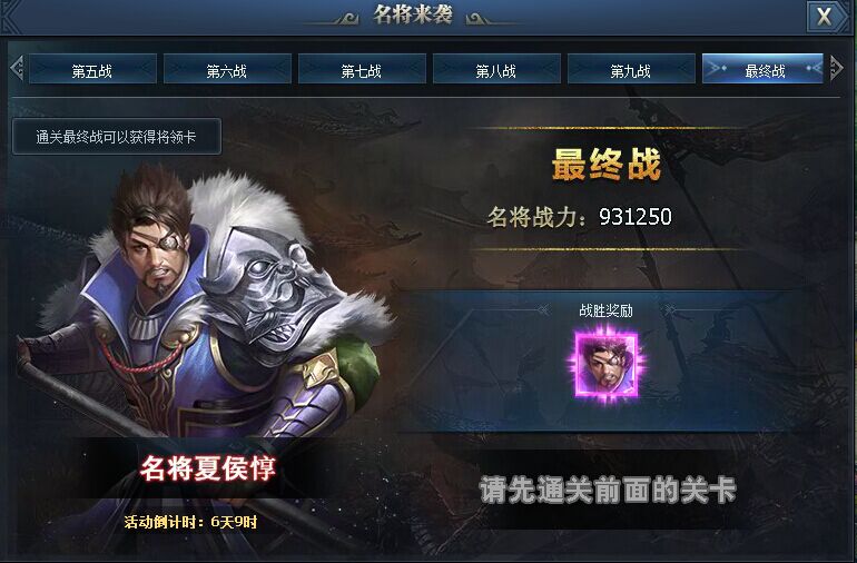 活动玩法:挑关成功可以获得对应奖励,完成最终通关,即可获得夏侯淳将领卡
