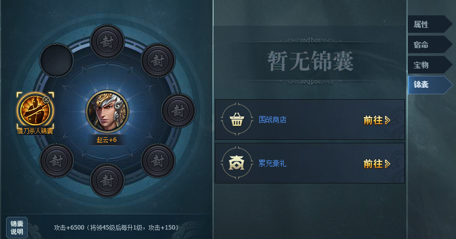 通过国战商店和累充好礼都可以获得锦囊,不同的锦囊穿戴后加成不同的属性,比如借刀杀人锦囊可以使将领攻击+6500