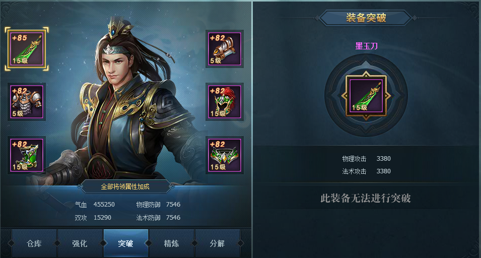 突破可以提升全部将领的属性加成,依然是可以分别提升武器、护手、铠甲、头盔、鞋子、腰带六大部位,不过普通装备无法进行突破,只有橙色装备才能突破,突破需要消耗血精石,此物品可通过参与活动获得。