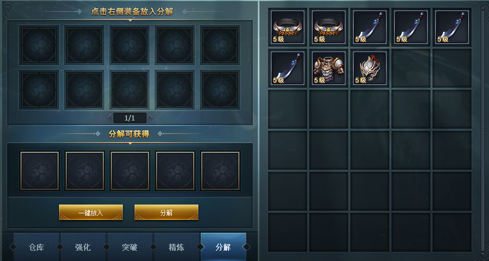 无用装备哪里放?自然是拿到分解处换取更实在的东西咯!通过分解可以将所有装备进行分解,根据装备等级会分解成强化石、装备精华等实用资源。分解后的石头又可以再次应用到装备强化当中。