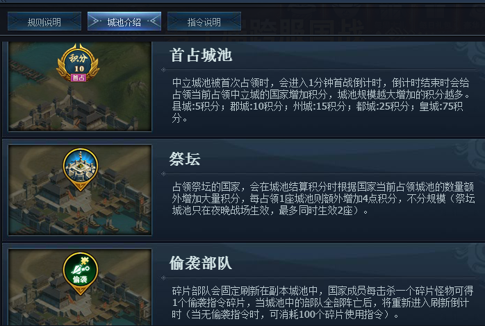 中立城池被首次占领时,会进入1分钟首占倒计时,倒计时结束时会给占领当前占领中立城的国家增加积分,城池规模越大增加的积分越多。县城:5积分;郡城:10积分;州城:15积分;都城:25积分;皇城:75积分。