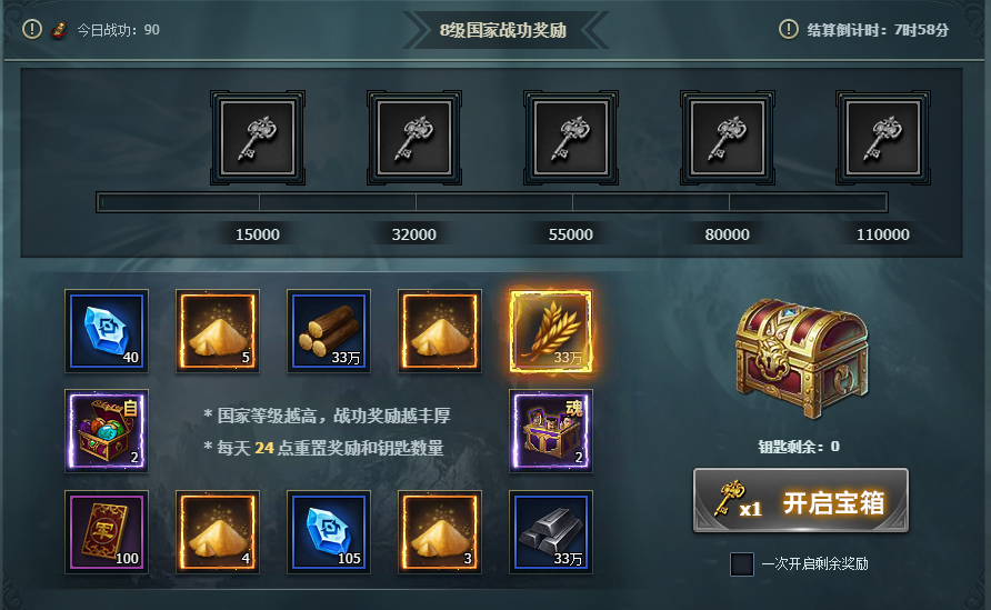 战功达到条件后即可领取战功之钥,使用战功之钥可以开启宝箱获得奖励。国家等级越高,可获得的战功奖励越丰厚。战功奖励和战功之钥的数量将在每日0点进行结算重置。