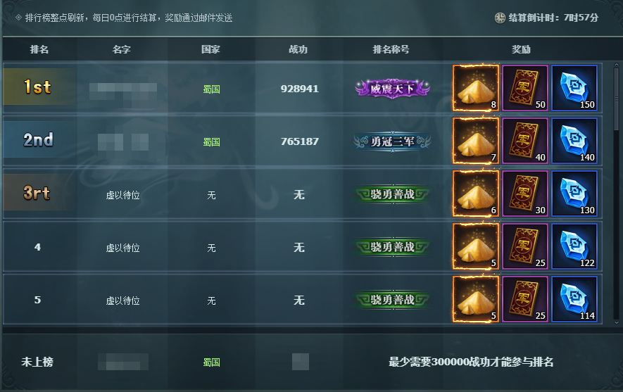 最少需要300000战功才能参与排名,排行榜整点刷新,每日0点进行结算,奖励通过邮件发送。