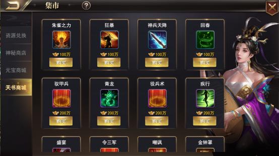 玩家可以使用元宝购买天书,购买之后会解锁对应的天书,解锁之后玩家该天书的残卷会加入到玩家的日常掉落中,神秘商店和求学中也可以购买或者抽取对应的天书残卷