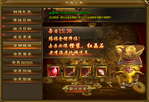 开服前7日,每日13:30分在指定位置会刷出一只送宝金猪,击杀后必爆橙装、红晶石等珍稀道具