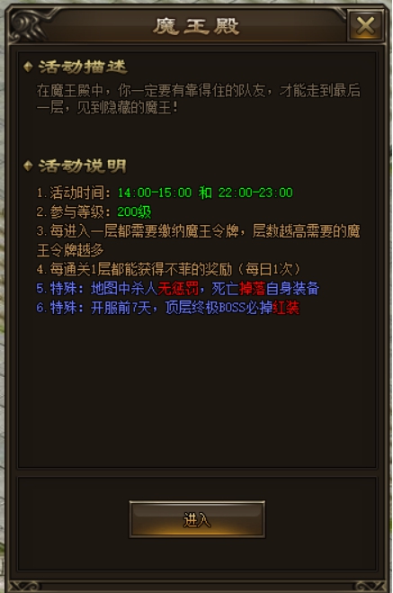 通关奖励每天只可领取一次,进入每一次都需要缴纳魔王令牌,层数越高需要的魔王令牌越多,开服前7天,顶层的终极BOSS必掉红装