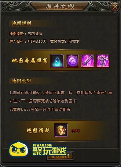 魔神之殿会掉落高阶魔装,有概率掉落神圣之泪和迷之石,魔神被击杀后过段时间会刷新,魔神之殿可PK。
