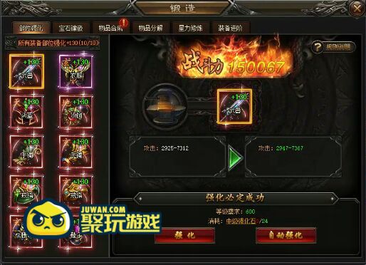 在特玩网页游戏灭神2神魔传说中,强化系统本次进行了大改版,较以前的升级概率变成了100%升级成功,但是每一级需要的强化石会越来越多,在属性加成方面还是以加攻击百分比为主,后期的优势较为明显。