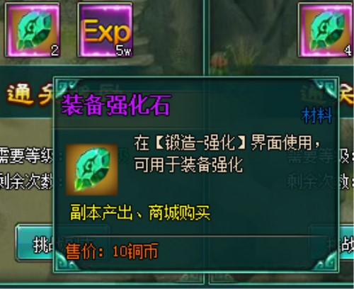 强化副本一共有24关,根据玩家人物等级一关以关的开启,最低的44级可以开启,最高的需要玩家275级才可以开启。强化副本顾名思义就是有关强化道具的副本,每一关都会掉落可以强化装备的道具,也只会掉落强化装备的道具。除此之外,还会有大量经验值,首次通关还会有银元宝的奖励。银元宝的数量根据关卡会原来越多。挑战成功的关卡第二天就可以通过一键扫荡的功能直接获得奖励。