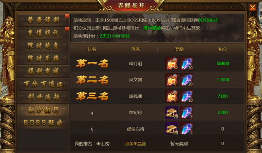 1.活动期间击杀1500级以上的boss和转生boss获得积分,活动结束后更加排行邮件发送奖励