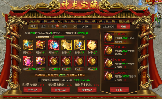 1.活动期间可以在神龙宝藏中抽取各种稀有材料和传奇币