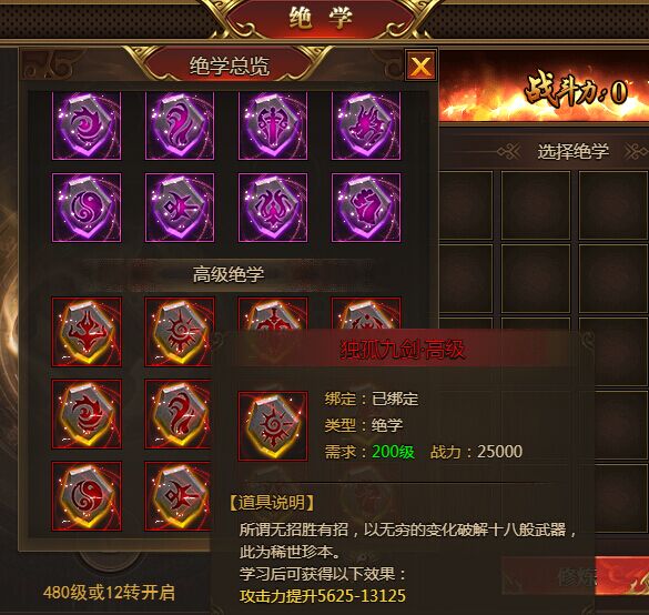 3、绝学按种类分12种,每种都有自己的独特属性,高级绝学比中级绝学有更好的属性值,但是属性类型相同