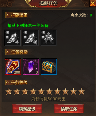 2.捐献任务有任务等级,最高10星,任务等级越高完成任务可获得的奖励越好