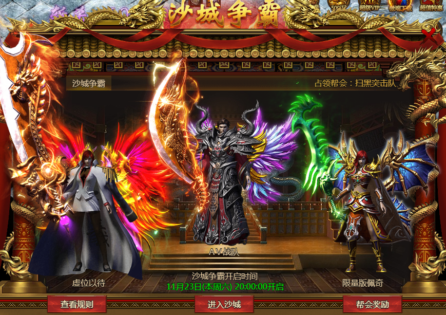 3、开服/合服首次沙城争霸活动无守城方。其他时间守城方为霸主帮会,攻城方为其他帮会