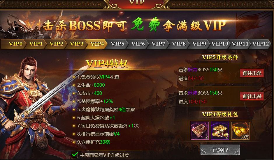 这个游戏VIP为打怪升级,只要你有耐心,V12不是梦。每天睡觉之前组好固定队伍,一起挂机,这样升级VIP最快,当到V8之后,就需要组一个打怪队伍,每天打创世神跟天劫BOSS。也是最肯爆装备的BOSS之一。