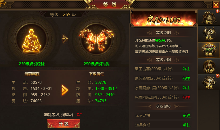 等级:在400级之前的等级丹,都是非常好爆的,平民玩家,可以选择多开小号方式来获取等级丹,土豪可以选择经验炼制,商城购买等级丹碎片。探宝不出等级丹。