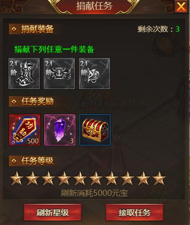 1. 玩家每天可以完成3次捐献任务,通过捐献指定装备完成任务