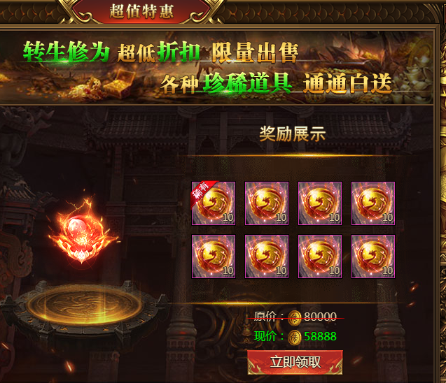转生:根据等级每天可以用元宝炼制修为,每天为5次。每两次转生就会出现一个转生礼包,购买之后,可以直接升级一个转生等级。转生越高,能进的高级地图就越多。