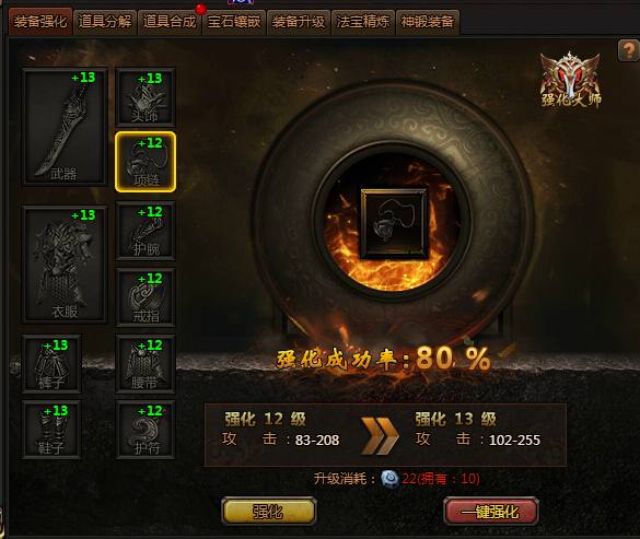 装备强化需要消耗强化石,等级越高强化概率越低,后面强化需要中级、高级强化石,可以通过普通强化石进行合成,普通强化石可以通过日常活动、每日副本获得。