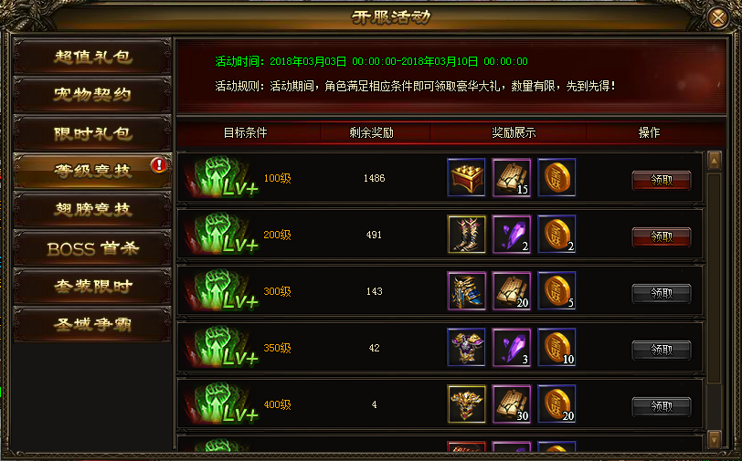 活动期间内,玩家达到指定等级可免费领取豪华大礼,数量有限,先到先得!