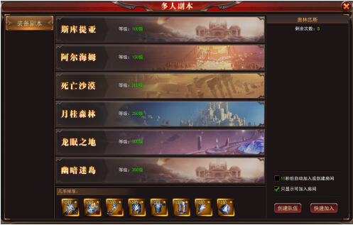 装备副本玩家多人副本-装备副本处进入,玩家可以选择一个对应的副本,如果点击“快速加入”,系统会为您自动匹配到合适的队伍。如果点击创建队伍,那您便自动成为新创建队伍的队长,可输入加入队伍的最低战斗力。