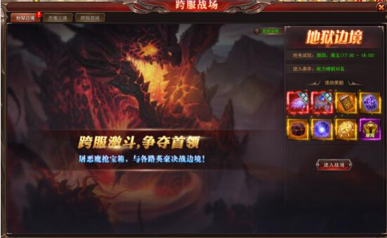 “地狱边境”为跨服定时活动,活动开启时可通过界面中间的提示面板点击“参加活动”打开地狱边境的面板。