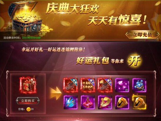 活动方式:20金币1份的幸运礼包,可随机开出1件超超超超值道具,快来试试手气吧!